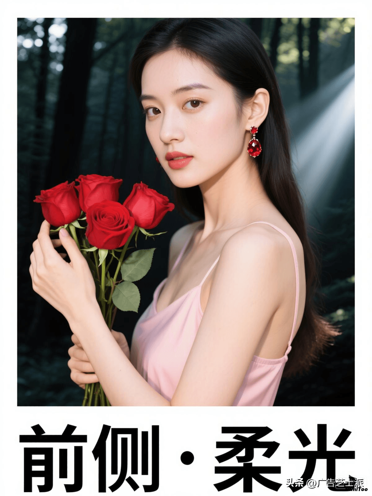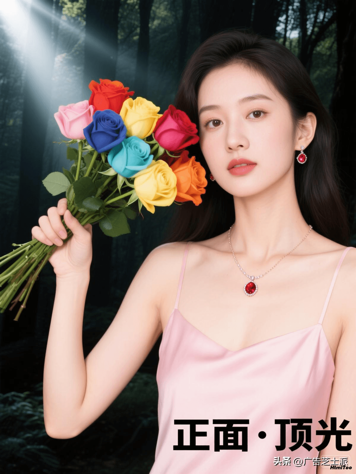 一位漂亮苗条的美女半身照,穿淡粉色吊带裙,戴红宝石项链,红宝石耳环,微笑露出两颗牙齿,手中拿着一束七色玫瑰花,站在暗黑的森林中,丁达尔光,概念光影,多巴胺风格,杰作,实景,相机拍摄,高质量细节,细节生动,用笔灵活,自然之美,大光圈,背景虚化,彩色光斑,中景,32K高清高分辨率