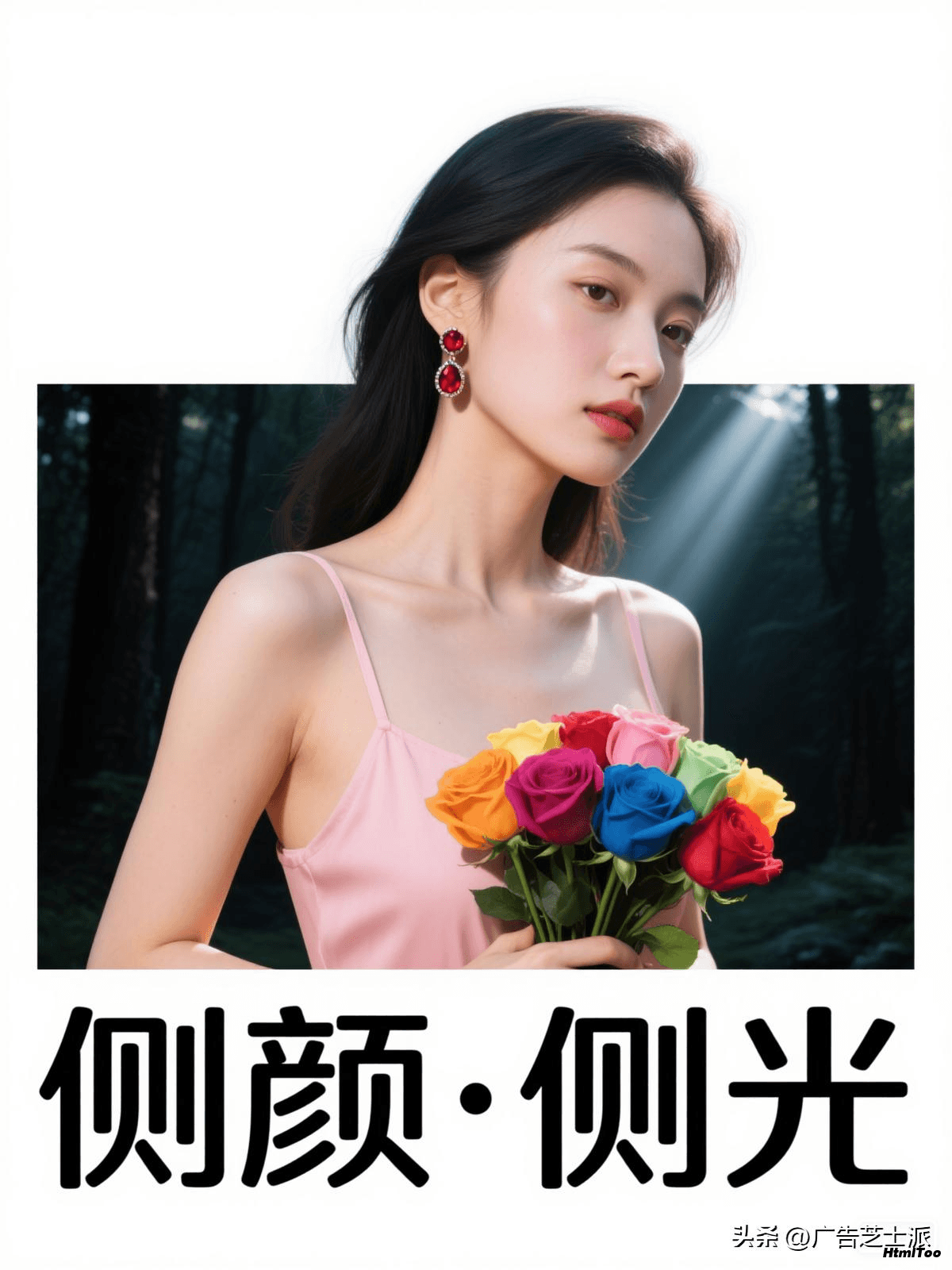 四分之三侧视角,侧光形成明暗对比,耳坠随头部微侧晃动