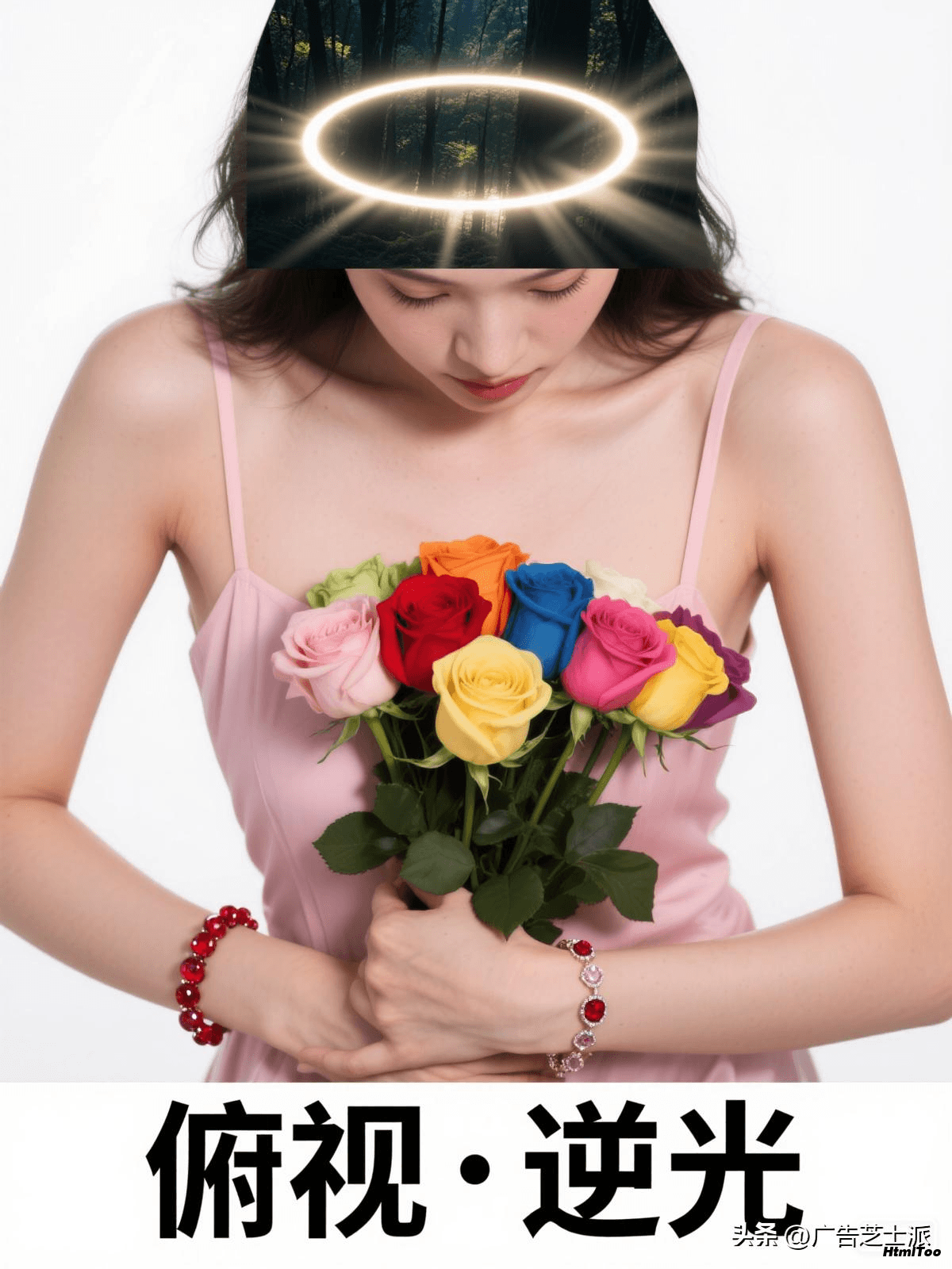 仰头视角,底光照亮下颌线,花束举过头顶更显灵动