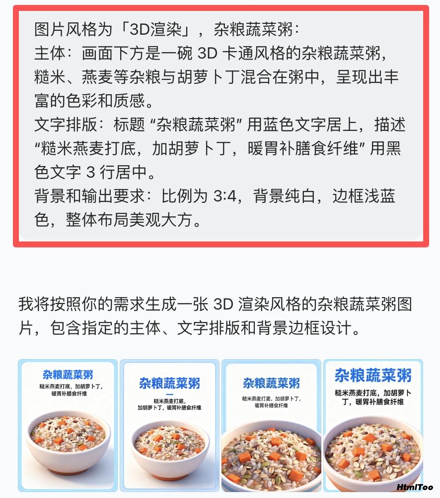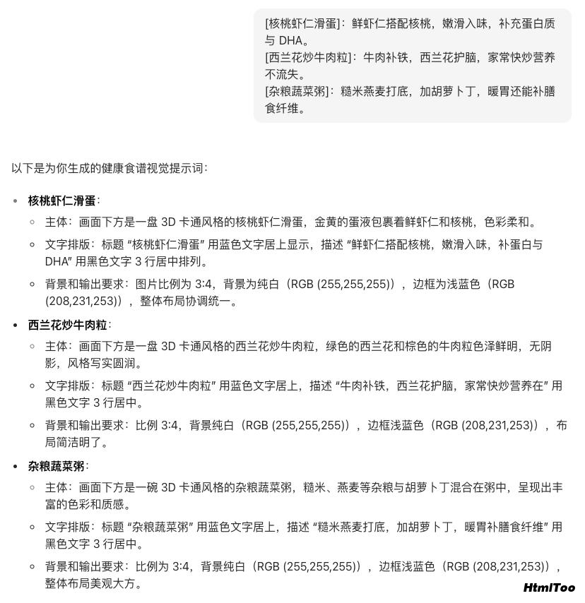 – 为每个健康食谱生成独立的图像提示词。