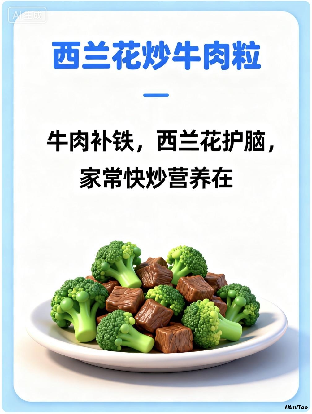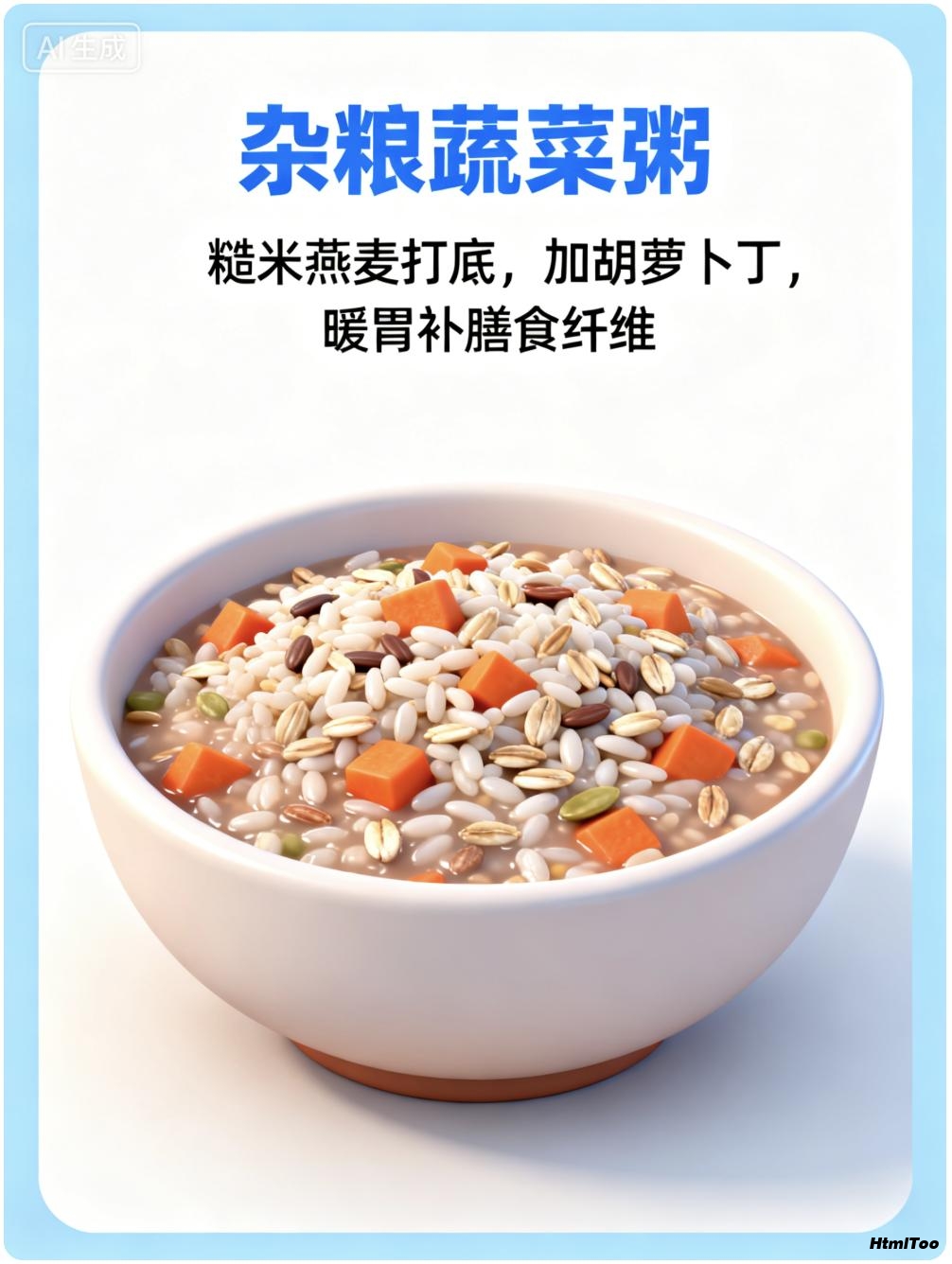 1. 图像提示词严格包括: 标题(蓝色文字,居上)、描述(黑色文字,3行居中)、健康食谱插画(居下)。