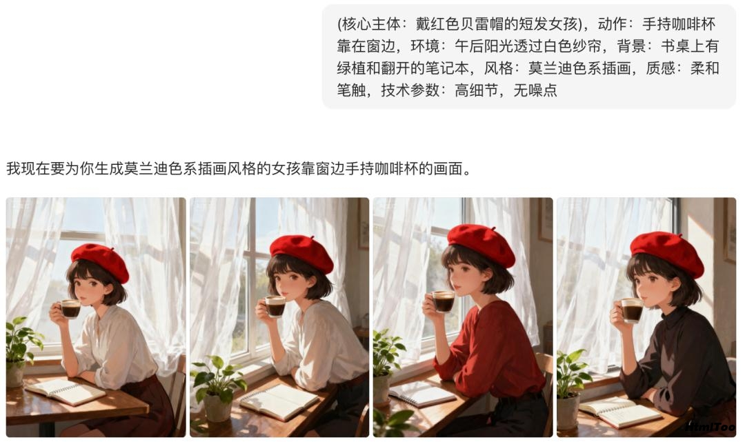 示例结构:(核心主体:戴红色贝雷帽的短发女孩),动作:手持咖啡杯靠在窗边,环境:午后阳光透过白色纱帘,背景:书桌上有绿植和翻开的笔记本,风格:莫兰迪色系插画,质感:柔和笔触,技术参数:高细节,无噪点。