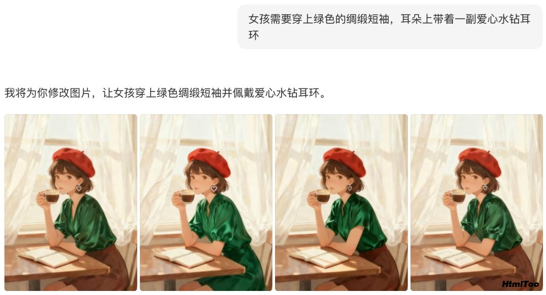 本次针对细节调整“女孩需要穿上绿色的绸缎短袖,耳朵上带着一副爱心水钻耳环”: