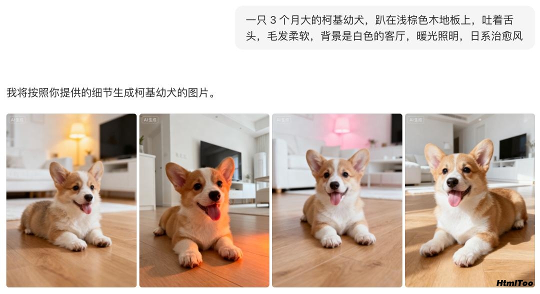 正面示例(具体):“一只 3 个月大的柯基幼犬,趴在浅棕色木地板上,吐着舌头,毛发柔软,背景是白色的客厅,暖光照明,日系治愈风”。
