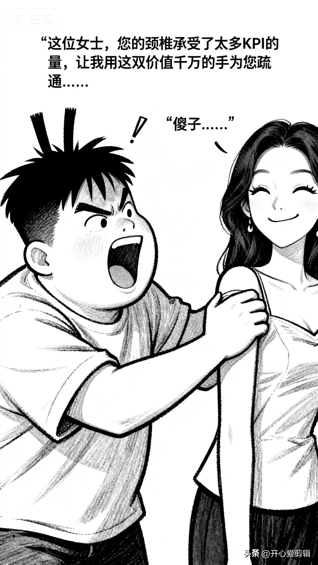 · 阿呆:“这位女士,您的颈椎承受了太多KPI的重量,让我用这双价值千万的手为您疏通……”