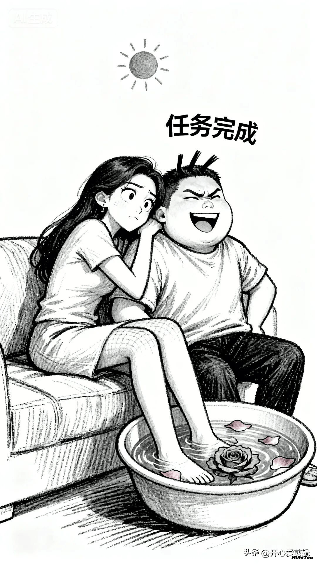 · 画面: 温馨全景。小美靠在阿呆肩膀上,脸上的乌云变成了小太阳,脚还泡在洗脚盆里。阿呆一脸“任务完成”的得意。