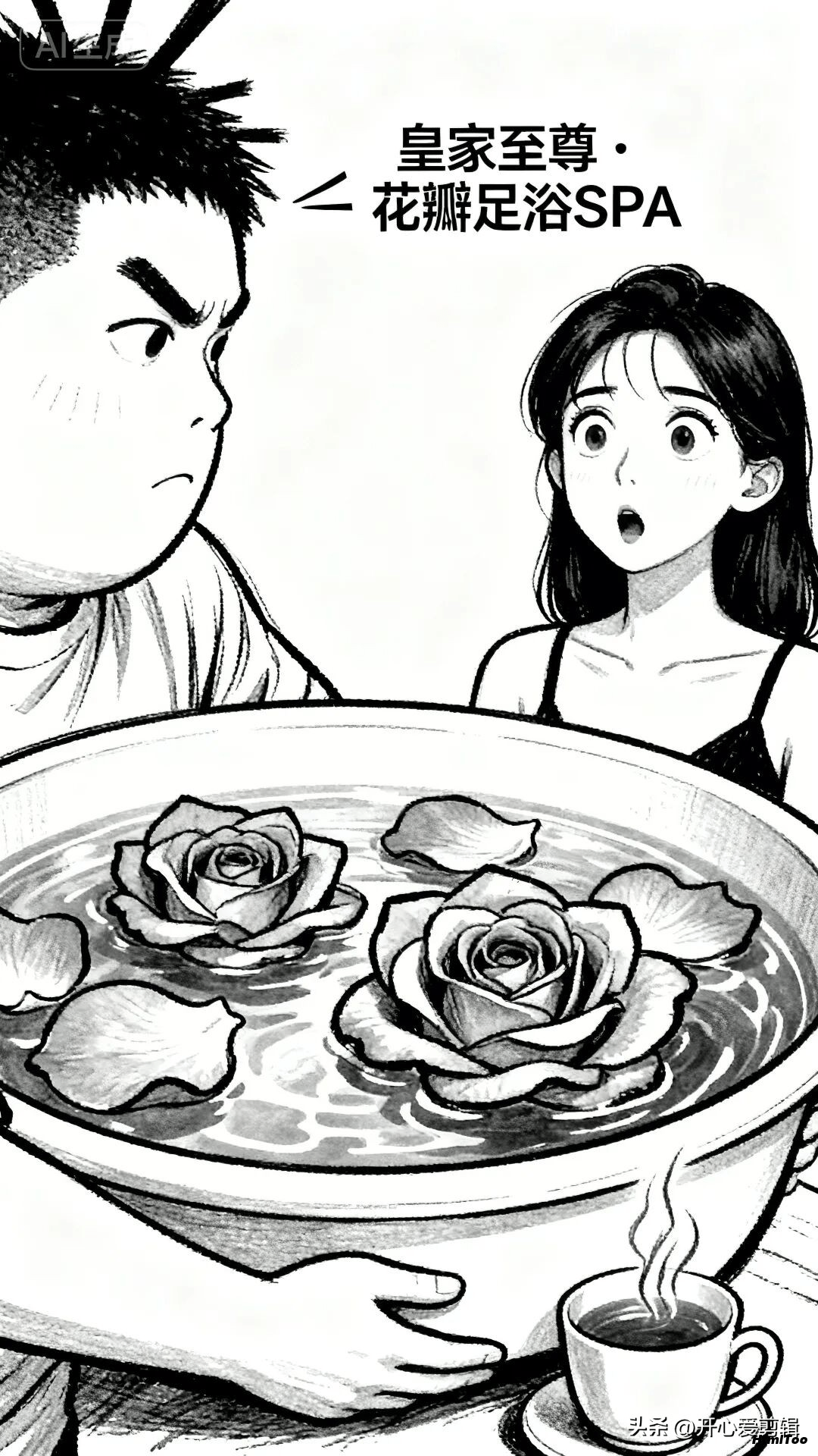 · 画面: 特写。阿呆端来一盆洗脚水,水面上夸张地飘着几片巨大的玫瑰花瓣(比脸还大),旁边还放着一杯冒着热气的茶。
