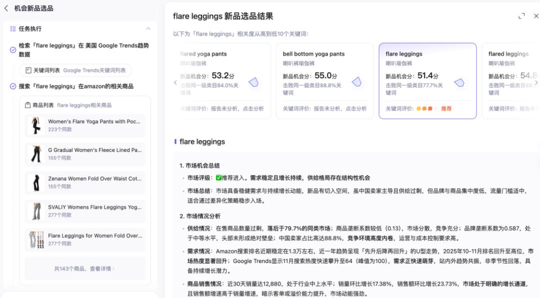 原本需要团队花上一周的信息搜集工作,现在AI用不到一分钟就能跑完,过程全程可回溯,选品逻辑可检验和推敲,且交付结果是一份量化的商业分析报告,相当于把大卖家的选品思路直接「翻译」了出来。